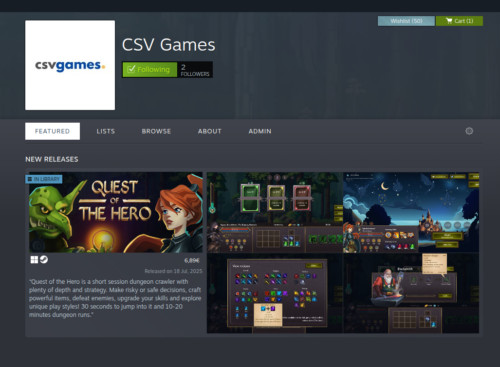 I got into indie game development, looking to create small and fun gaming experiences for PC (Windows and Linux). Website: https://csvgames.com Tech stack: I am using Godot for developing games Games so far: * Quest of the Hero (dungeon crawler) * more coming soon 😄